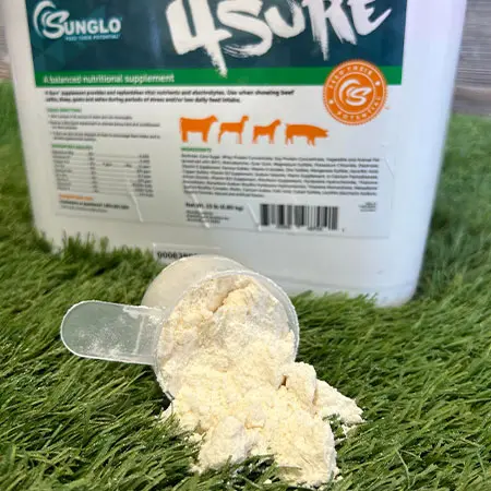 The amount of 4Sure that you feed, or mix into the water, depends on your animal. For show pigs, sheep, and goats, we recommend feeding 4Sure the week up to your animal’s target show at a rate of 2.5 ounces (one scoop that’s included in the container) twice a day. When mixed with water, we recommend 2.5 ounces (one scoop) per 16 ounces of water or more and mixed thoroughly. For show cattle, we recommend 5 ounces of 4Sure per 2 gallons of water or less water for a more concentrated mix.