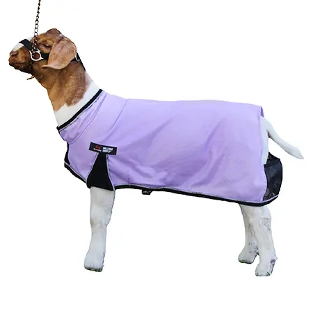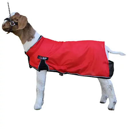 The Cool Tech Blankets are designed with innovative cooling technology. The material is designed to keep the lamb or goat cool with breathable interlocking material. The material is highly rated for durability and aids in keeping the lamb free of debris. This material also acts as a protective shield, equipped with a proactive anti-mosquito barrier with anti-UV protection. The blankets have improved sizing that allows for a up to date comfort fit. Newly added performance features consist of the Spandex Pleat Designed to allow increased movement when exercising, and also the Spandex Front Column Designed to allow for a larger opening when putting on the blanket over the head. A must have product for the summer when blanketing show goats.