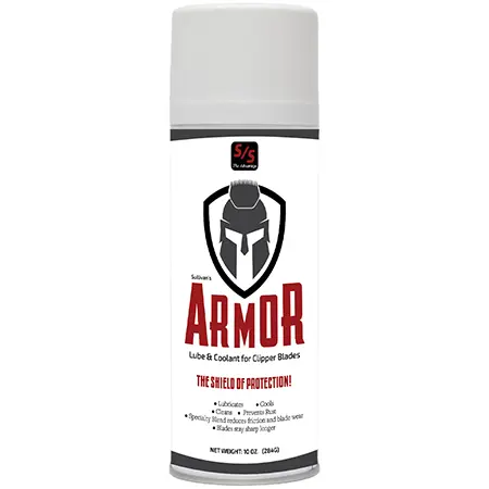 Armor Lube & Coolant provides instant cooling and long-lasting lubrication for clipper blades. Blades stay sharp longer and the life of clipper blades are prolonged by keeping the blades cool during extended use. The specialty synthetic blends found in Armor immediately reduce friction to prevent blade wear and dissipating heat away from blades. This new blend does not break down as quickly as other products, creating a superior shield of lubricity. DIRECTIONS: Simply hold can upright 6 to 8 inches away from blades and spray until they become clean and fully coated before starting to clip. Repeat as needed during usage of clipper. Helpful hint: when finished clipping, spray blades with Armor to clean and prevent rust from setting in on the blades.