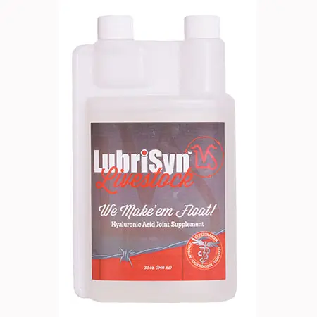 LubriSyn is the revolutionary all-natural, liquid joint supplement. The active ingredient is Hyaluronan (HA), which is naturally found in the body as part of synovial ?uid. It acts as a lubricant and shock absorber for the joints. Hyaluronic Acid (HA) replenishes synovial ?uid in joints which becomes broken down as your livestock age and gain weight. For optimum results, daily dosage is recommended. Safe for livestock of all ages. Best results if started 120 days before show. Administer 30 mL daily to cattle; 15 mL daily to hogs and 10 mL daily to sheep/goats