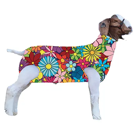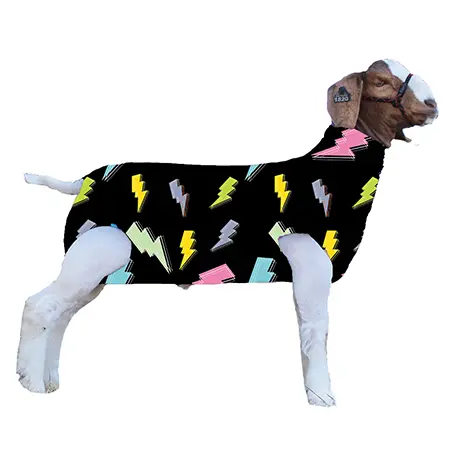 A special stretch tube specifically size fitted and tailored for goats. Keeps goats clean until show time. Material is 85% nylon, 15% lycra spandex. Machine washable. Small (fits 30 – 65 lbs.) Medium (fits 65 – 100 lbs.) Large (fits 100 – 135 lbs.) X-Large (fits 135lbs and up)
