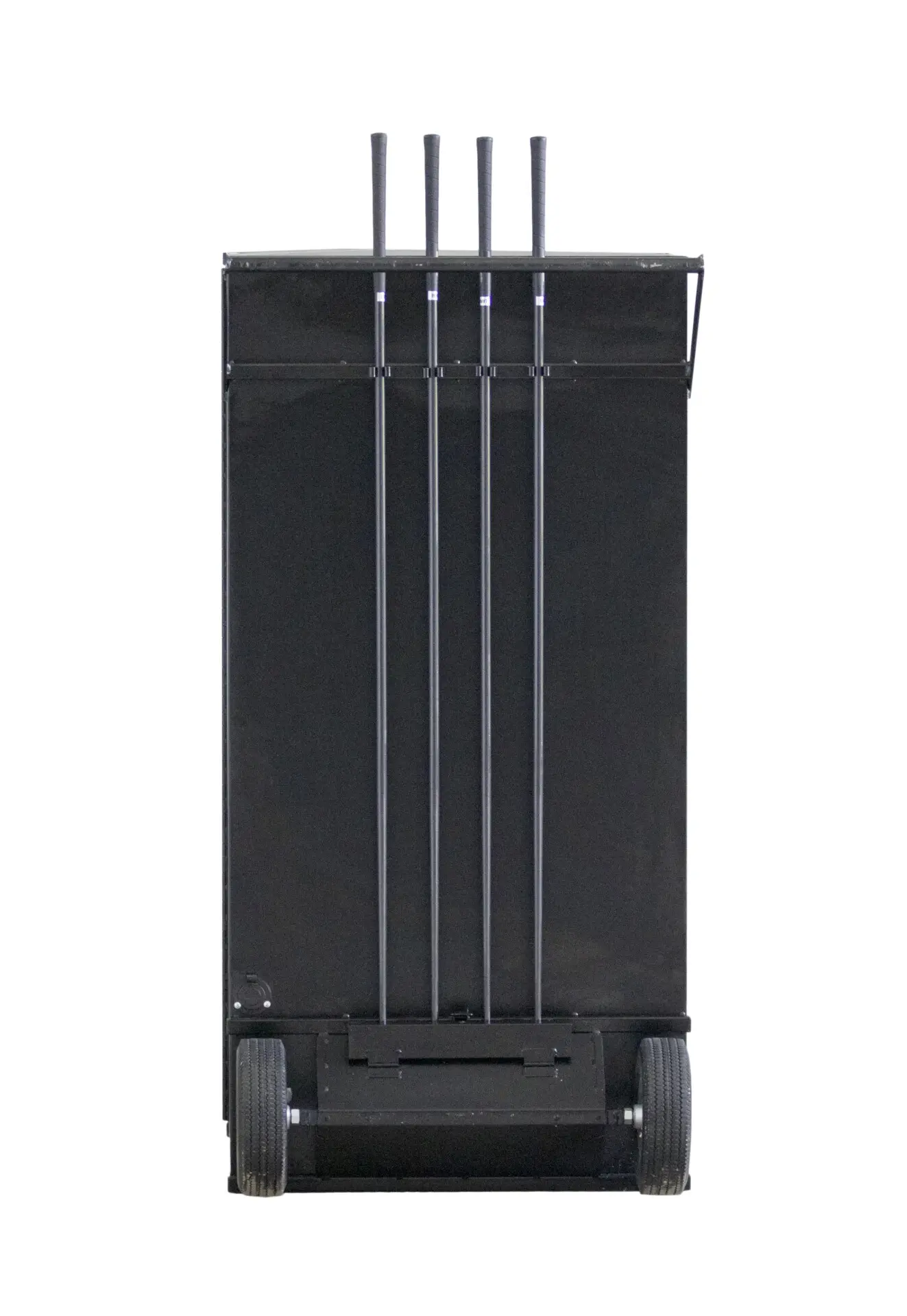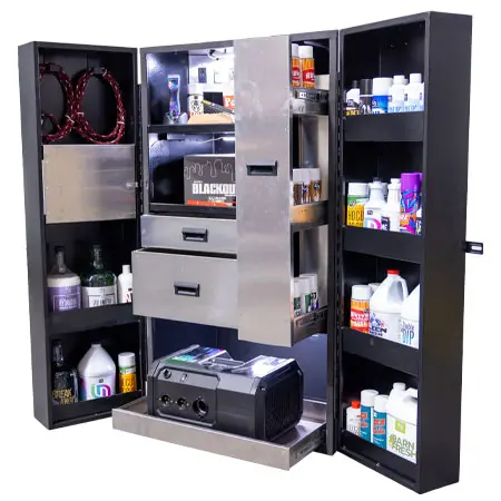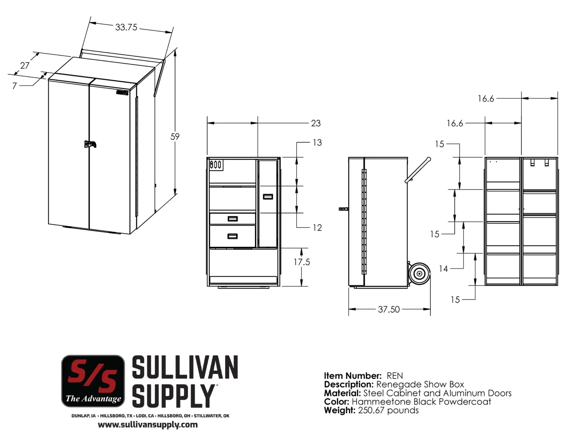 Sullivan’s Renegade Show Box. This high-end quality show box has all the bells and whistles. First of which is the charging station located in the top compartment of the main body. The lockable side door compartment allows you to keep your valuables safe while charging them, also great place to keep wallets, purses, registration papers and other valuable documents. The next feature is the LED lights throughout the center body of the box to help you find what you’re looking for in poorly lit areas. This box also comes equipped with a can holder slide out for easy access to your aerosol cans and quart bottles. And a durable pullout shelf at the bottom so you won’t need to strain yourself grabbing things in the back of the box. The fully loaded show box is topped off with a beautiful finished Black Hammer Tone Powder Coat to give it a sleek, sharp look. Made with the highest quality craftsmanship, the Fully Loaded Show Box will cover all your show road needs.