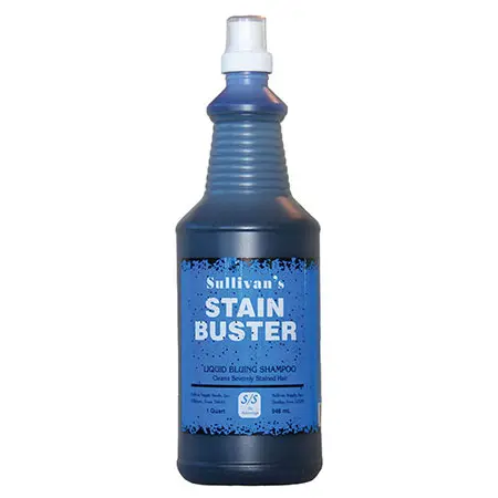 Stain Buster is an extra strength liquid bluing shampoo that cleans hair that has been severely stained from urine or manure. It gets the hair white again. This is a ready to use product. Use as directed.