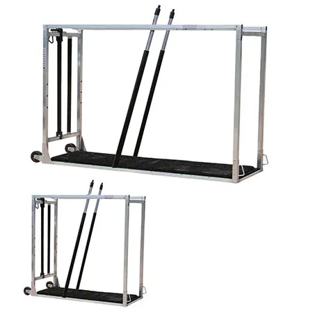 STORAGE: First remove top and sidebars then loosen bolts at the base of the chute. Once bolts are loosened, lift the back of the chute up allowing the extension floor to drop. Slide the chute into itself and tighten the base bolts. Unpin and fold down front and back upright bars, loosen bolts on the top and sidebars to fit into allowed spaces and tighten bolts. Make sure all bolts and pins are tight and secured prior to transportation.