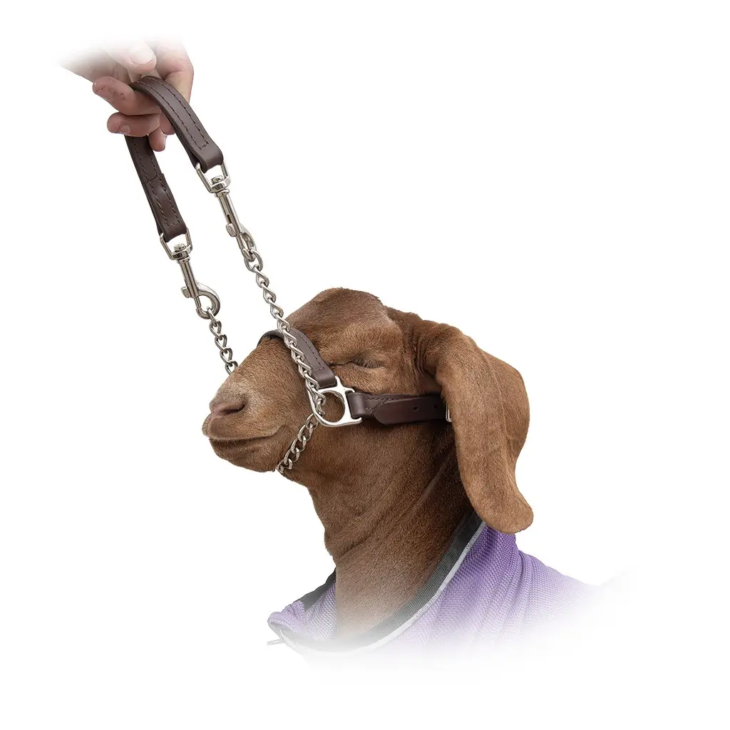 Struggling to control your goat with a collar, but find chain leads too slippery? The Showman’s Choice Goat Halter offers the control of a show halter with the comfort of a neck chain. Its chain and handle design provide better head positioning and balanced pressure on both sides of the face. The hybrid handle features adjustable length with snaps on each side. Perfect for home use and the show ring. Made from durable Biothane. Adjustable size, available in black and brown.