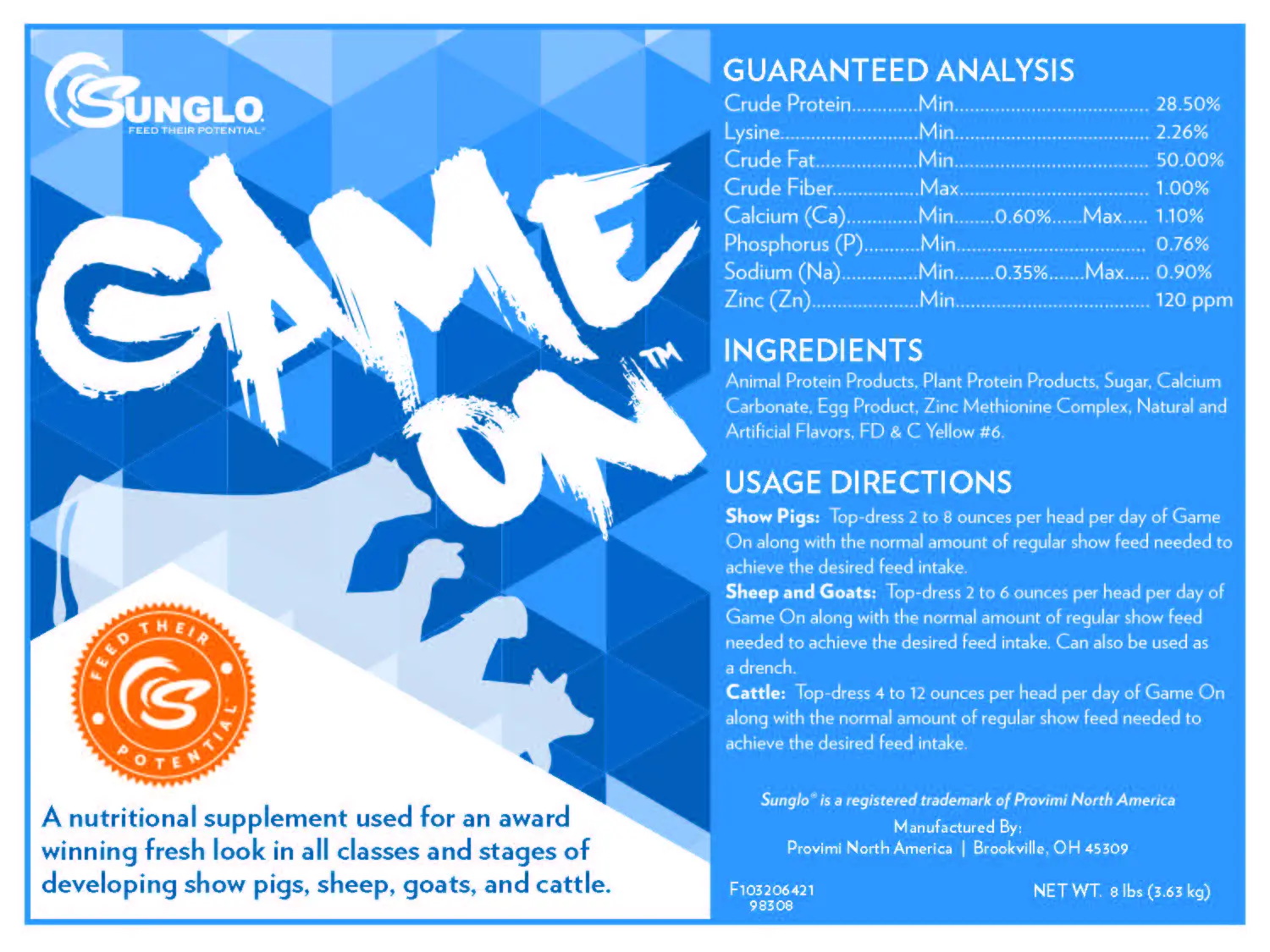 • Hog Feeding Directions: Top-dress 2 to 8 ounces per head per day of Game On along with the normal amount of regular show feed needed to achieve the desired feed intake.