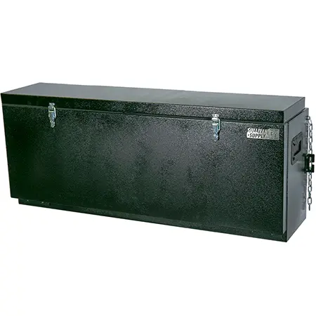 The Stockman Show box is a versatile double opening hanging show box. It features a top lid equipped with a whip holding box that opens to the top shelf basin, perfect for storing small items. This lid now allows you to open fully while hanging against a wall or gate. The front door is held closed with a new magnet design and opens to the drawers and bulk area. This door now allows you to open while the box is sitting on the floor or a table. The main case area features 4” and 7.5” drawers and open space tall enough for pump up sprayers. This box is constructed of smooth aluminum and coated in our hammertone black coating.